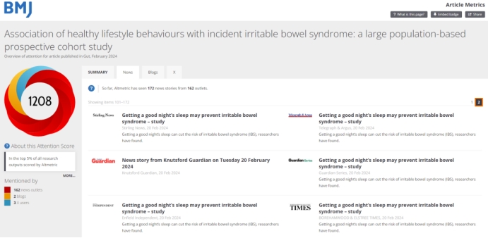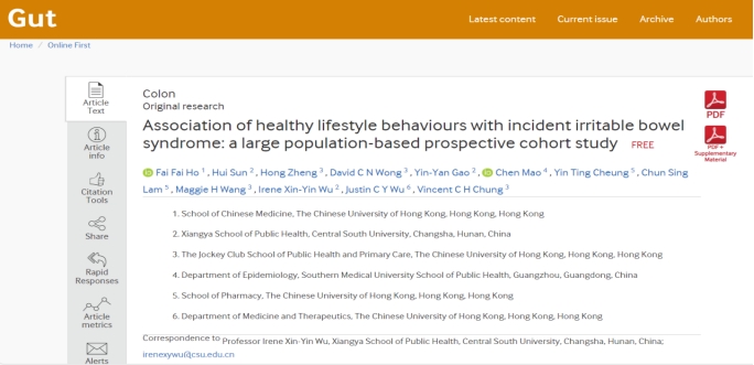 流行病与卫生统计学系吴心音教授团队的研究成果 “Association of healthy lifestyle behaviours with incident irritable bowel syndrome: a large population-based prospective cohort study”。已有包括美国有线电视新闻网(CNN)、英国独立报(The Independent)、卫报(The Guardian)在内的162家新闻媒体报道了该研究。该研究工作由成人有声小说